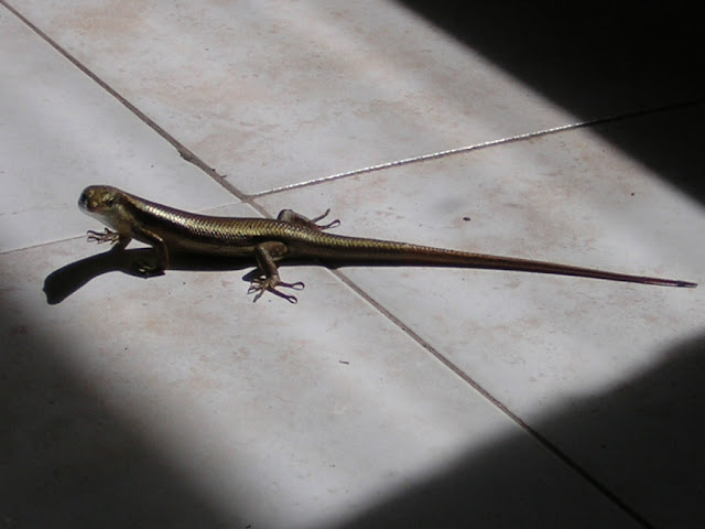 There are big, beautiful snails here that look like seashells and there are shiny lizards that run along the steps. Everyone thinks I'm odd for taking photos of the snails, but they really are lovely! It is hot and humid here, but not enough to be uncomfortable. The windows in the house are designed so that they are always open because of the heat. There are geckos that climb the walls inside the house and they are very cute. They make kissy noises! A stray cat sits outside meowing all the time but it will not let us pet it. Dogs wander along the beach and sometimes jump in the ocean to try to catch fish and swim. My dog at home would be carried off into the sea very quickly! I was annoyed because I got a bug bite on my face. However, when I woke up this morning, I had a bug bite on my butt, so now the one on my face doesn't seem that bad. LOL.
