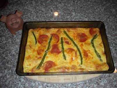 5. In your toaster oven pan, put a layer of pepperoni, then a layer of shredded cheddar and mozzerella cheese, followed by just a few more pepperoni. Pour the cream/egg mixture on top, coating the pepperoni and cheese as thoroughly as possible. Throw a few pieces of cooked asparagus on top if you're trying to be fancy, (we had some leftover pieces from last night's dinner.) Some diced onion and/or bell pepper would be good too.
