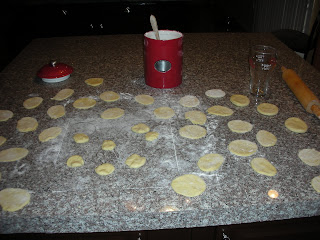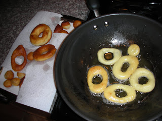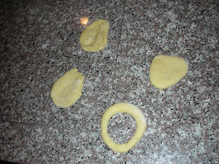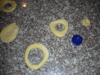 The original Recipezaar recipe resulted in dough that was much too sticky to work with. Adding additional flour fixed the problem. But how was I going to get these doughnuts to look doughnuty? Sexy Nerd & I don't have any cookie cutters.