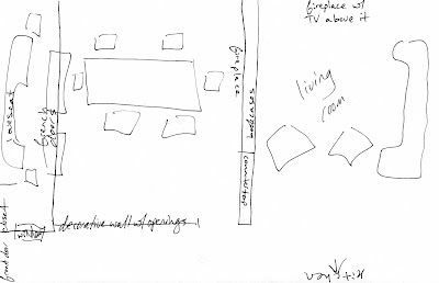 Okay, maybe those aren't exactly the most helpful drawings! Basically, the changes that would me made, other than moving around furniture and light fixtures, would be to build two walls in the upper left corner of what is currently the living room, essentially creating a little, formal living room, perfect for 2, 3, or 4 people (5 would probably be 1 too many!) to sit and talk, with snacks and tea. When you walked in the front door, there would be a large window on your left, providing a peek into this cute new room.