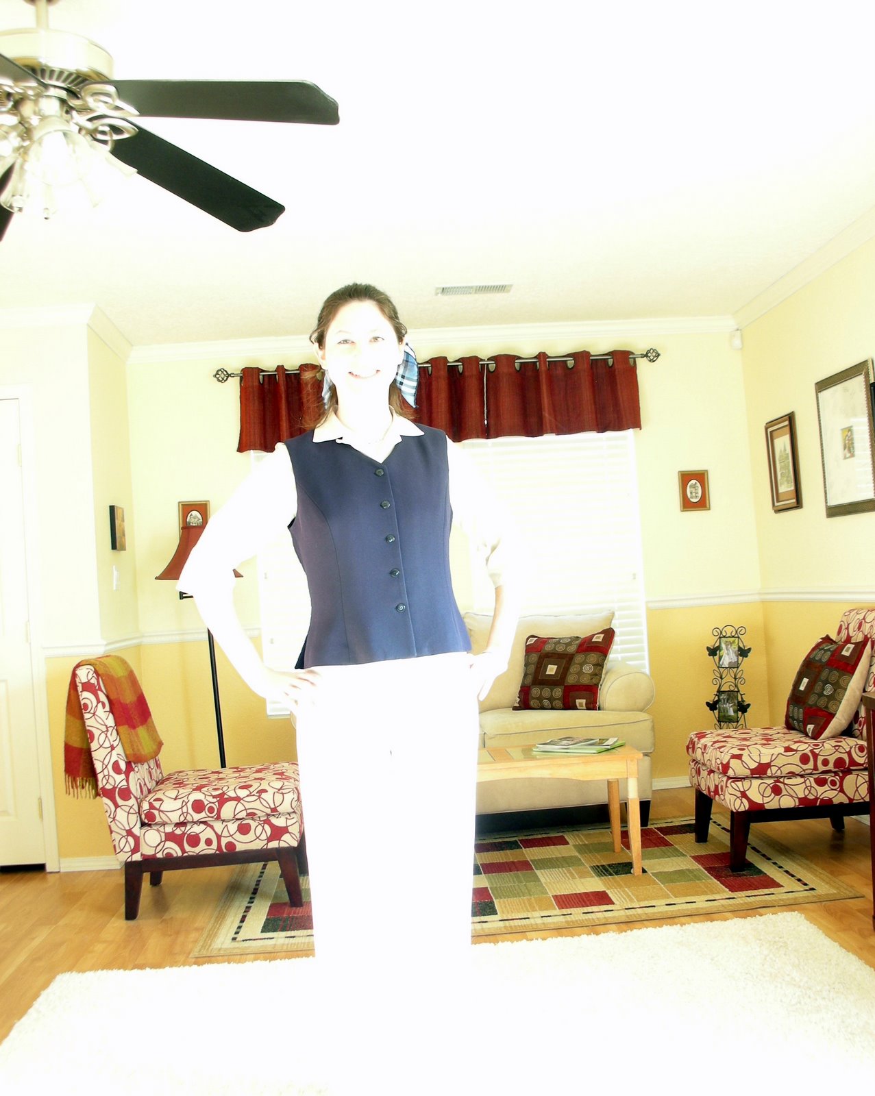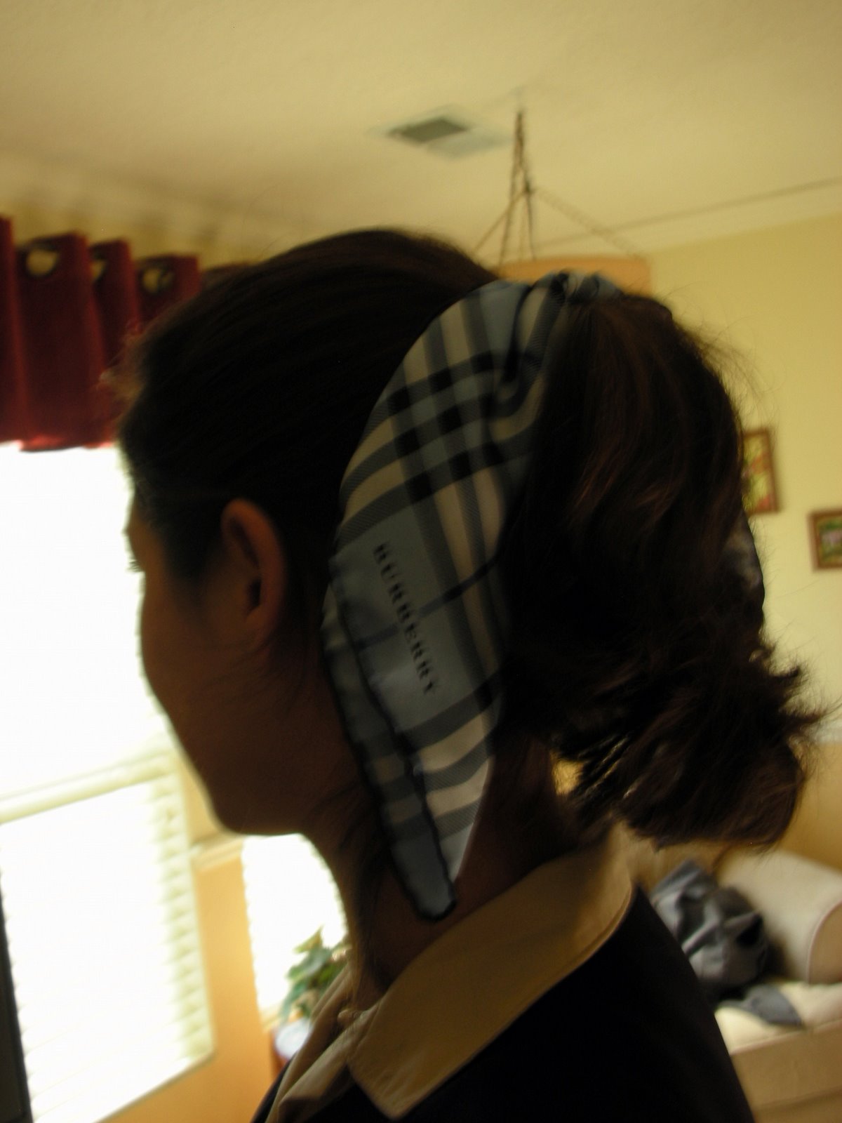 This leads me to my plan for today. I put together a super-professional outfit that my boss is bound to love. I'm wearing the Burberry scarf she gave me in my hair. Incidentally, I'd also say I look like a flight attendant, ready to fly off toward a fun adventure. Can you say "sending hidden signals"?