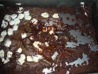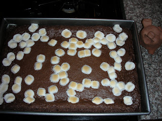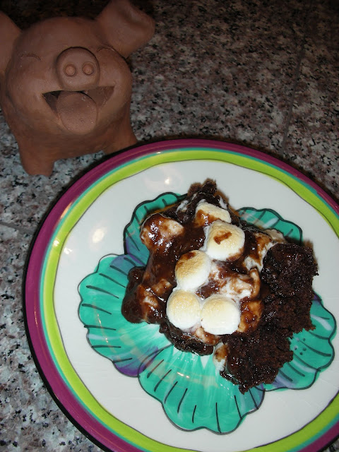 The last time I made this, I topped it with marshmallow cream. But, we're all out. (Seriously, it might be time for me to go to the grocery store.) Instead, I used mini marshmallows. They were added about 10 minutes into baking and the oven was switched to the broiler setting.