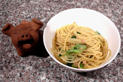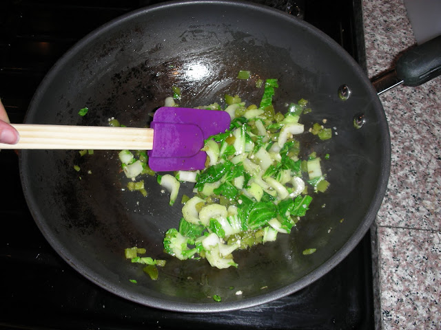 Start some spaghetti boiling, then fry bok choy, bell pepper, and garlic. I only had 1/2 of a bok choy to use. An entire bok choy would have been much, much better!