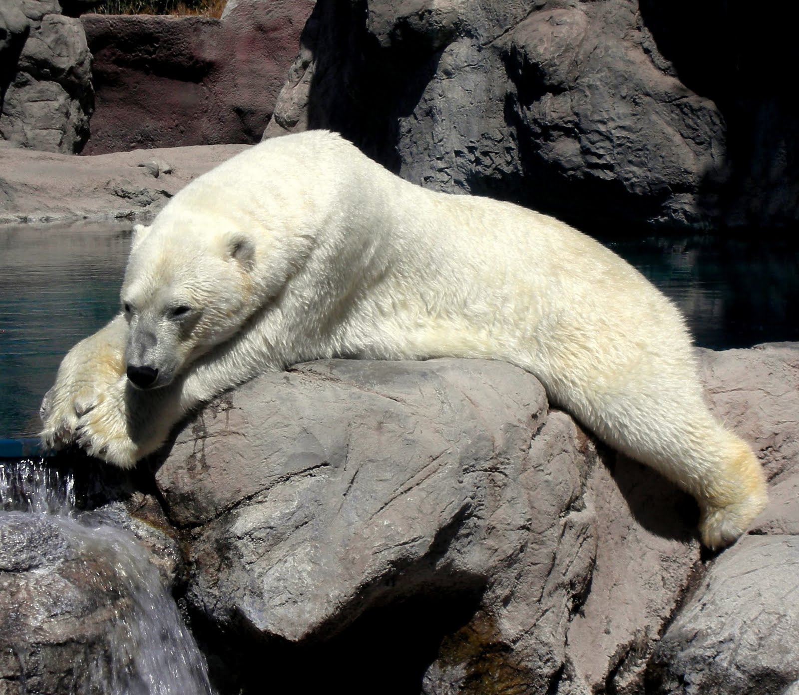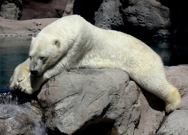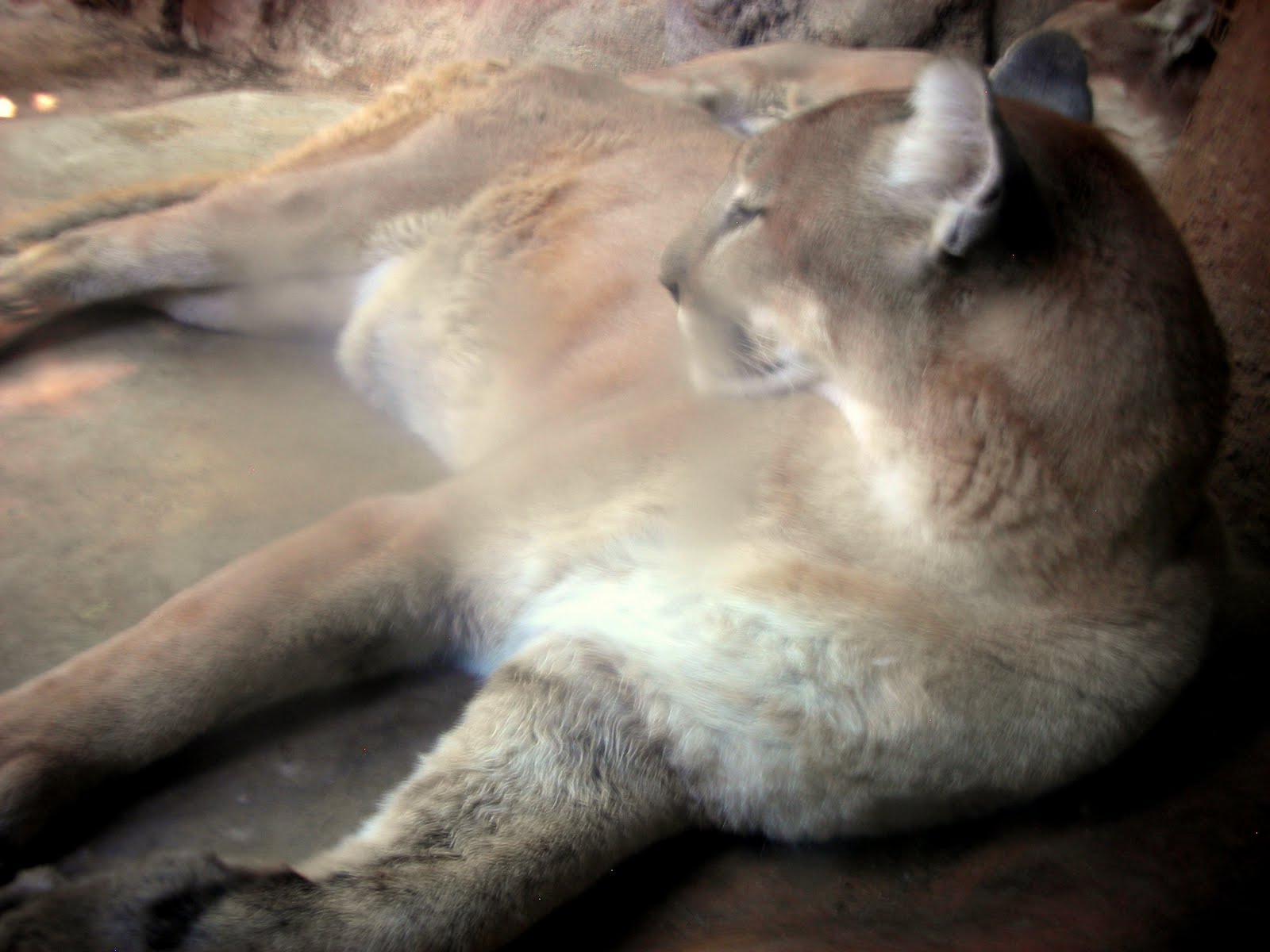 This mountain lion has been pacing back and forth, scouring the crowd for weak children to pick from the pack, every time we've ever been to the zoo, except for this visit. Perhaps he finally caught one. He does look content.