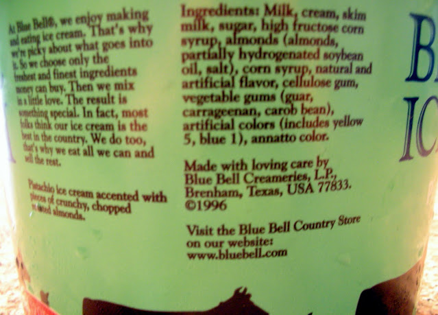 According to the column on the left, Bluebell ice cream uses only the freshest and finest ingredients money can buy. They also "mix in a little love." The result? Partially hydrogenated soybean oil and high fructose corn syrup, just the way Grandma used to make it.