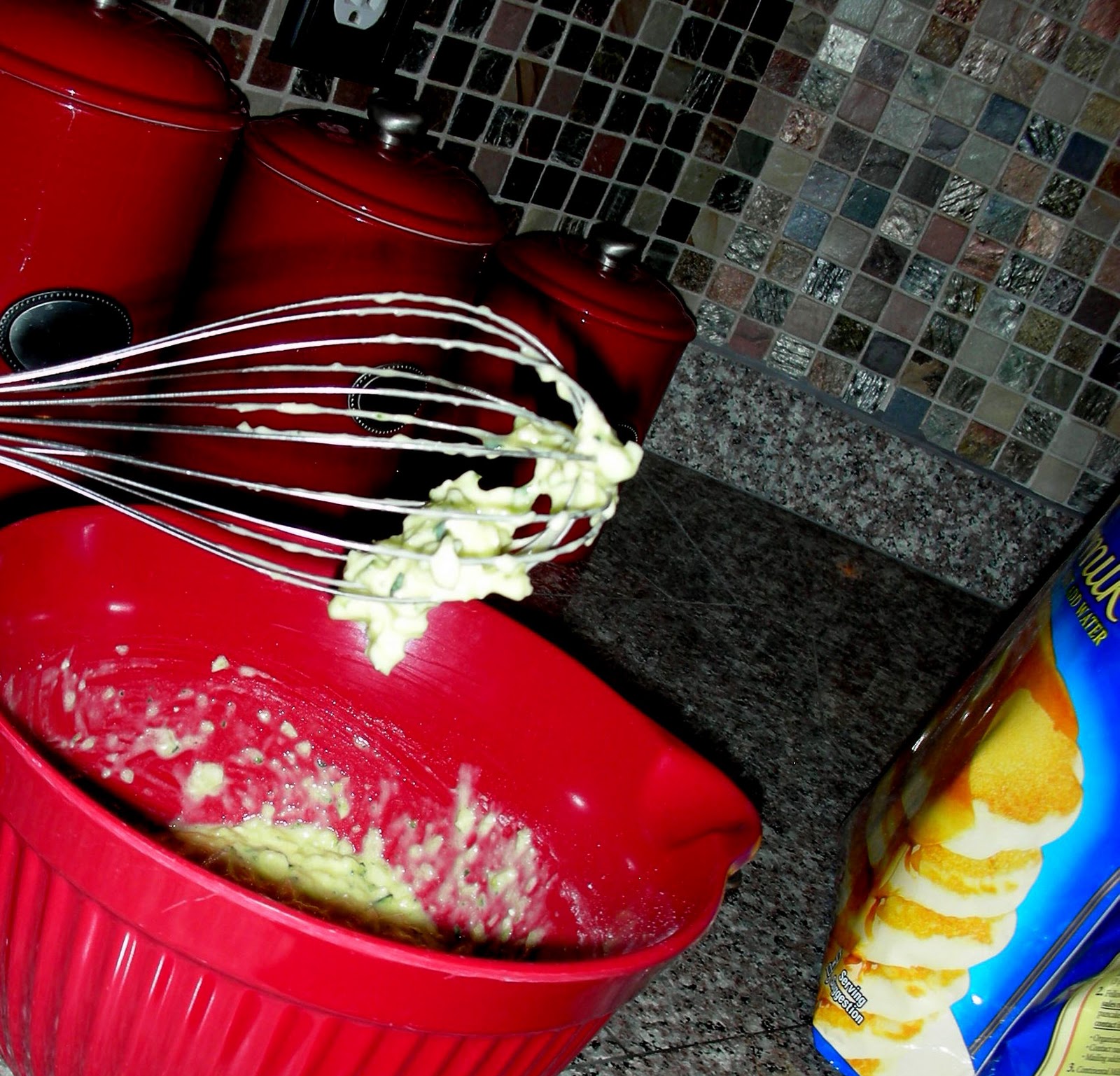 Mix in 1/2 a cup of pancake mix. Does it concern me that Sexy Nerd and I go through several of these 10 pound bags a year? A little.