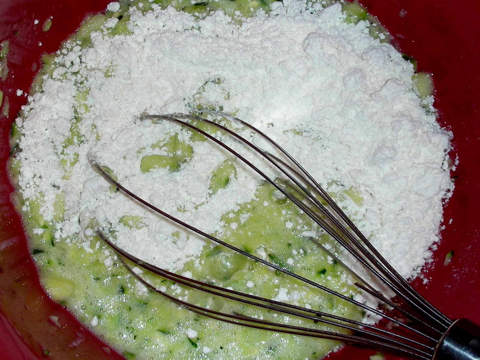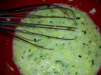 Mix 1 cup of zucchini in with your eggs. There is no need to drain any moisture from the zucchini.