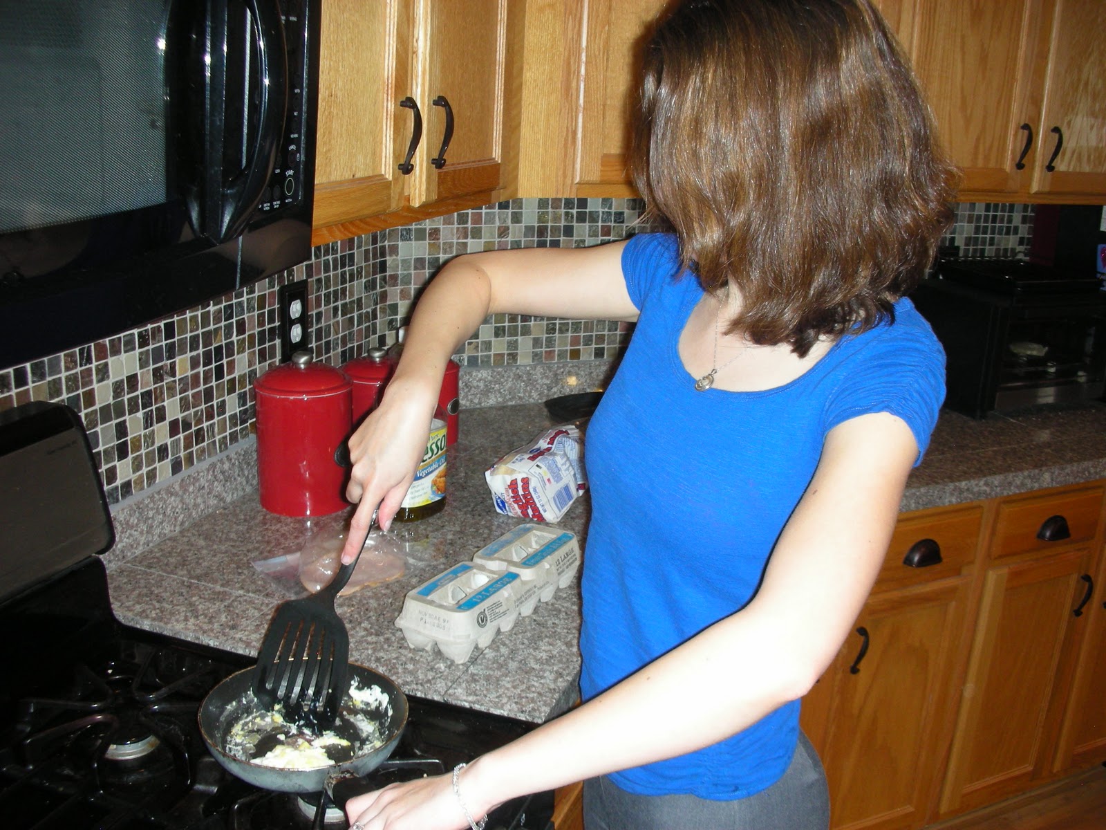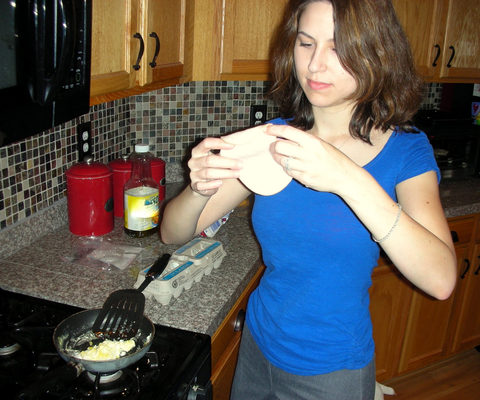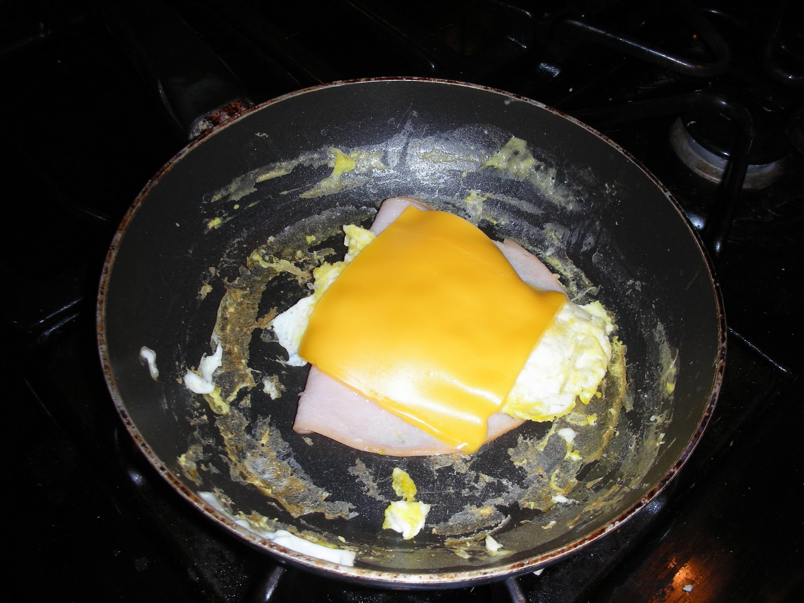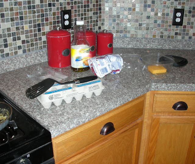 While Sexy Nerd microwaved his Jimmy Dean D-Lights, I gathered eggs, cheese, and English muffins.