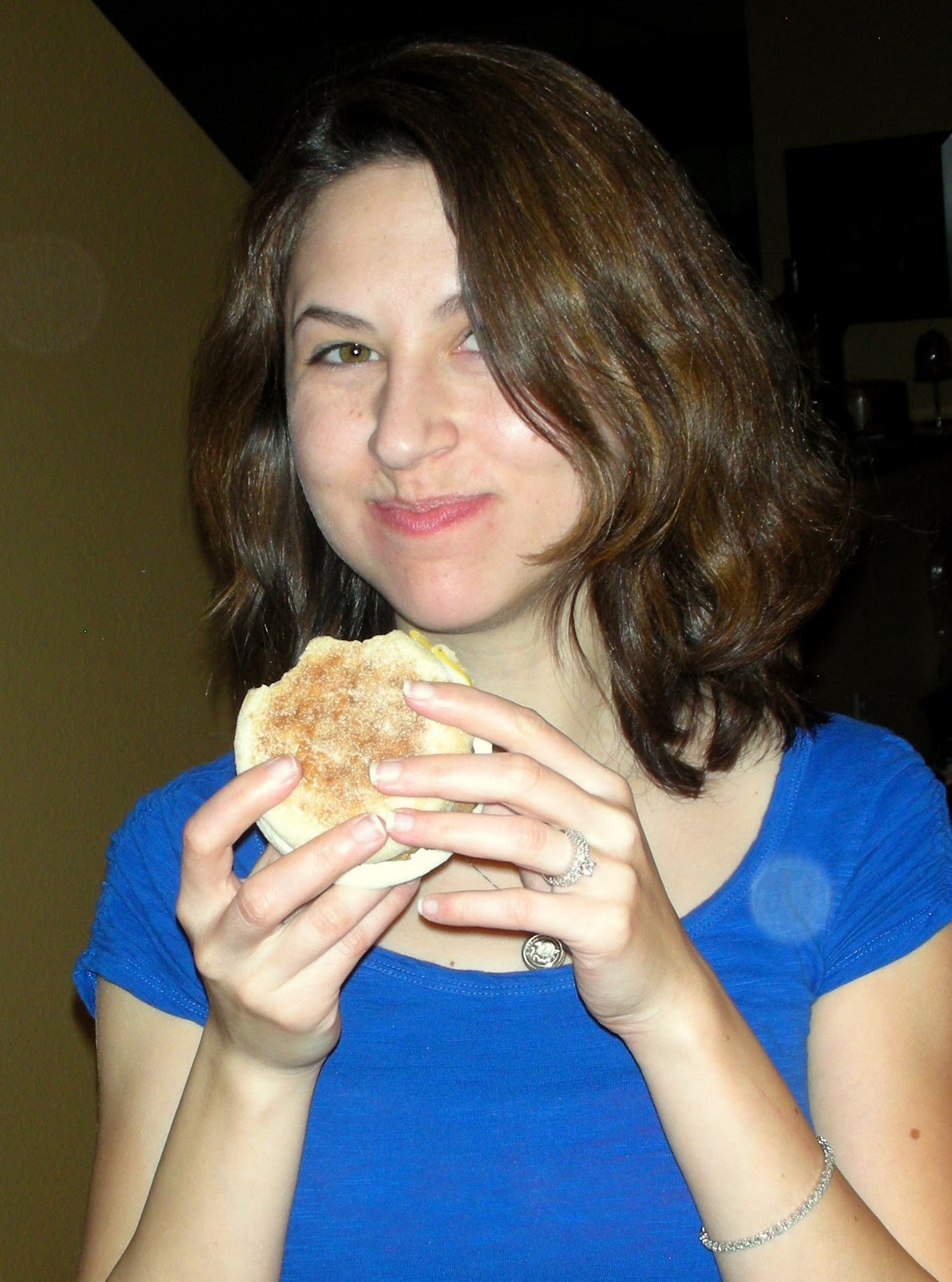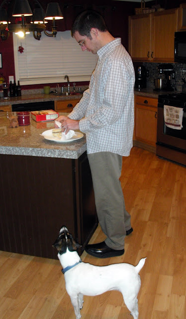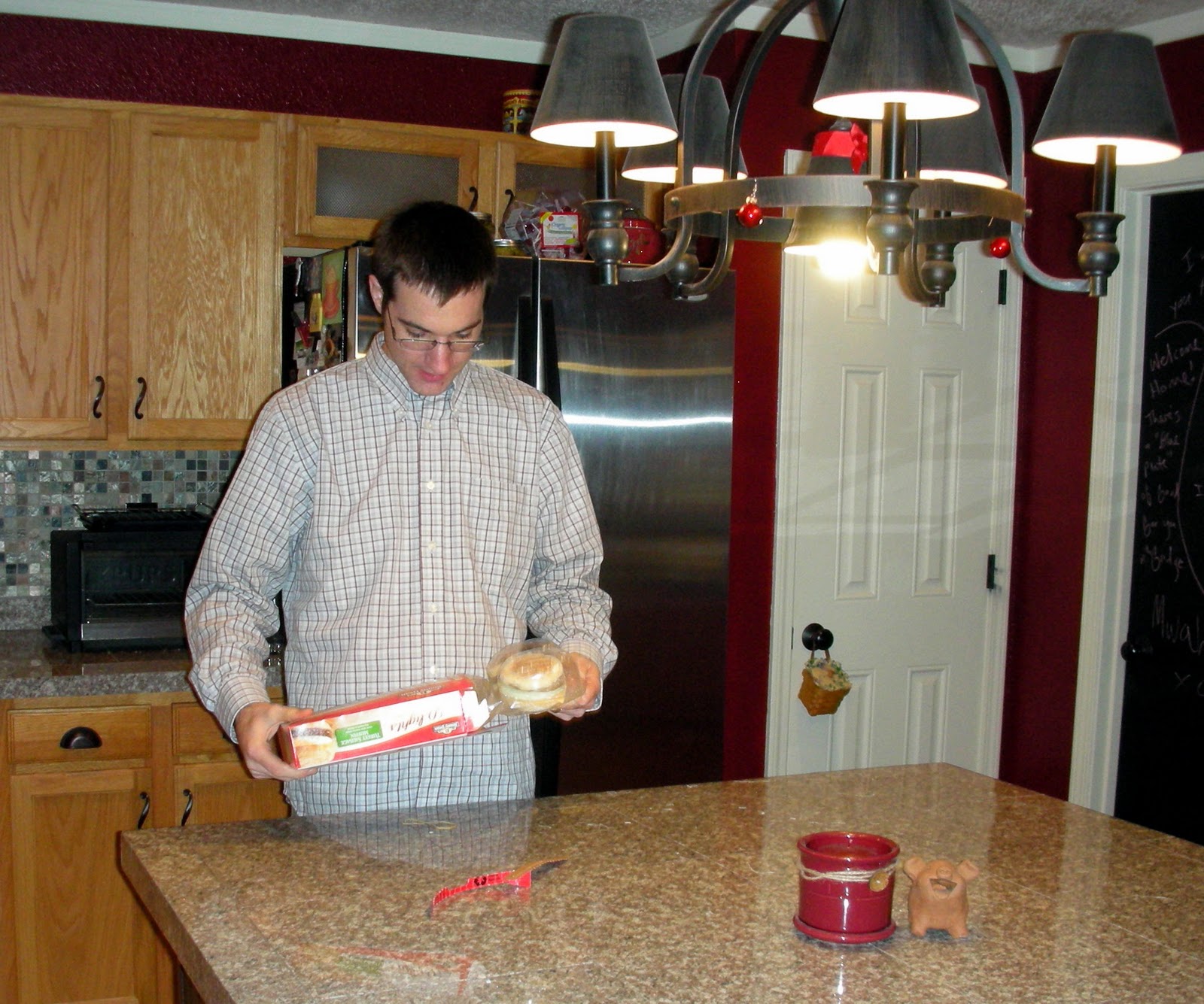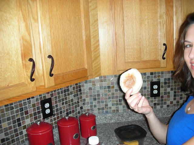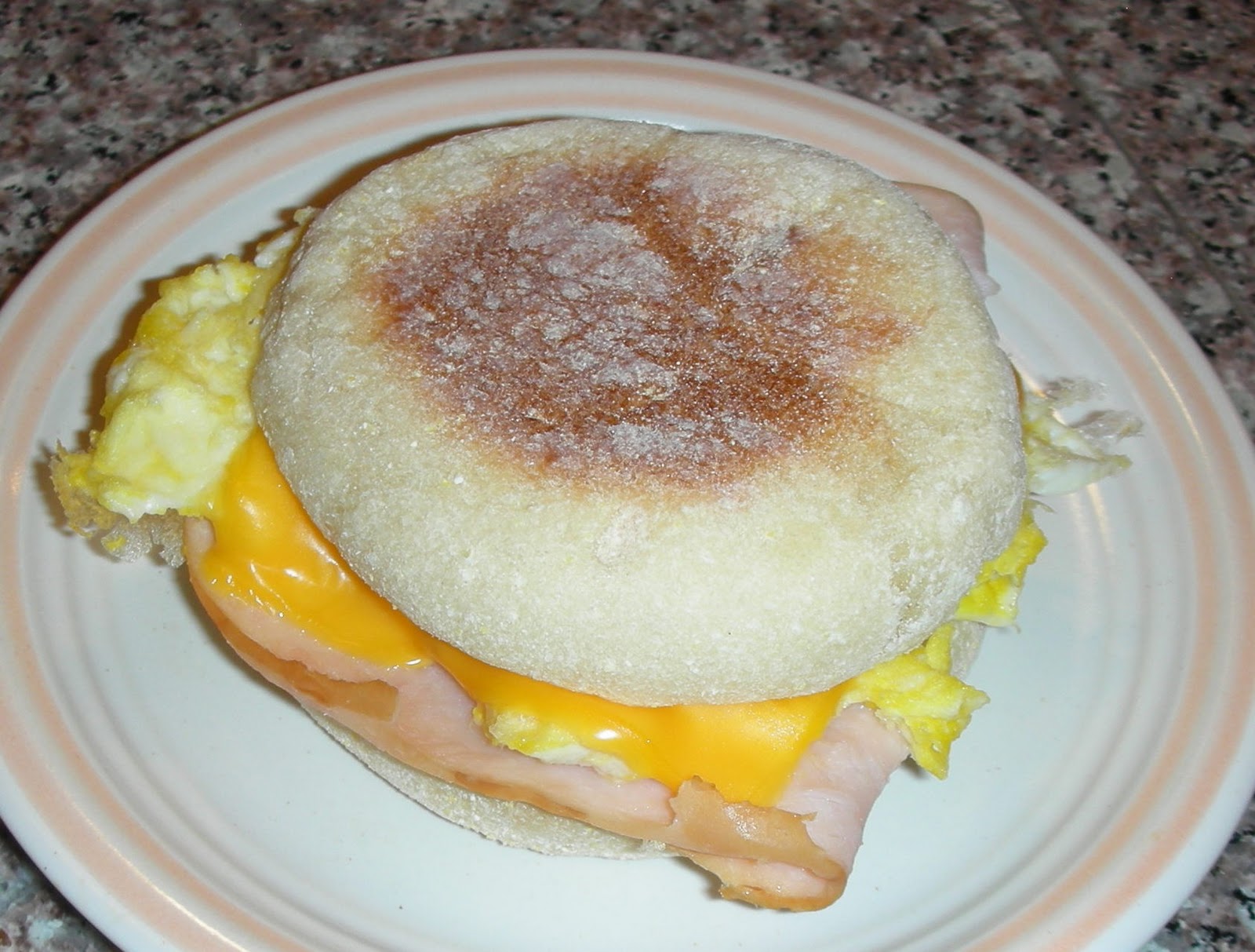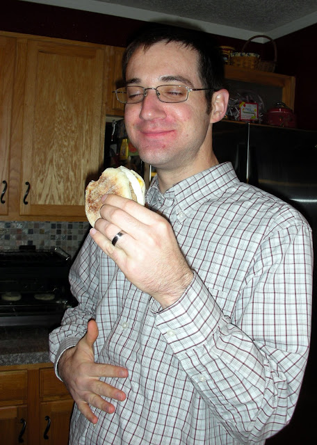 (He was enjoying his Jimmy Dean D-Light, but was also rubbing in the fact that my English muffin was still cooking in the toaster oven while he ate this.)