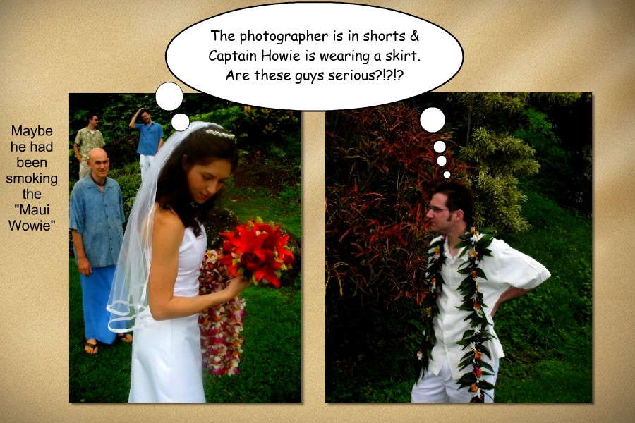 As mentioned before, Sexy Nerd and I did not have a typical wedding. Our vows were interrupted by a live chicken. When doubting our photographer, we were told not to worry because he's "#1 in Argentina". My dad caught the wedding officiant, Captain Howie, relieving himself in the bushes immediately following the end of our ceremony (really, do not use Above Heaven's Gate Weddings on Oahu!)