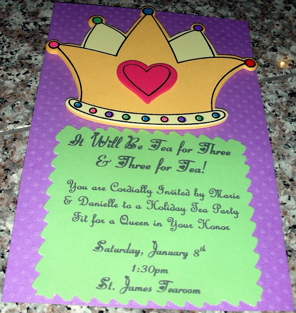 I'm not at all crafty, so I was pretty pleased with how my tea party invitation turned out. The crown is a $0.75 wood accent from Michaels.