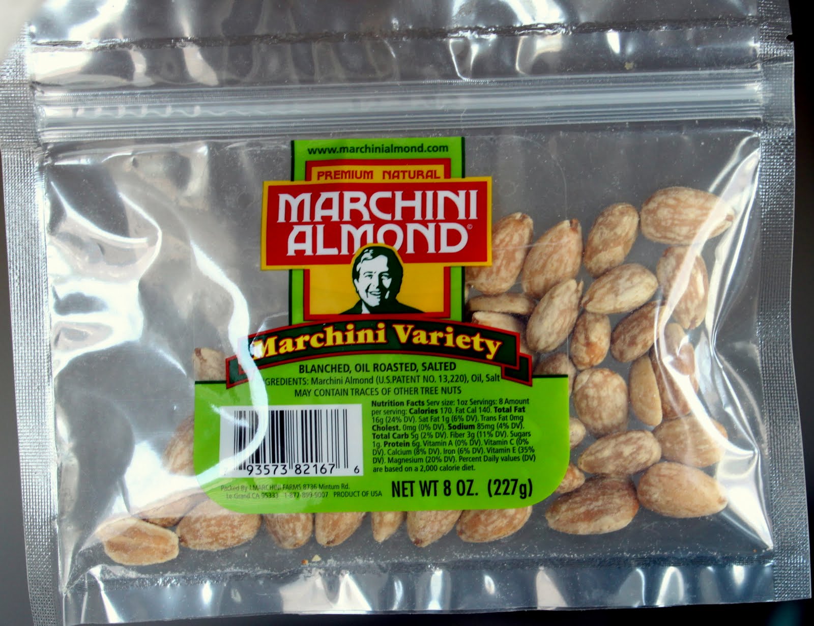 Delicious and deceptive almonds from Marchini Almond! Deceptive, you ask? This photo is my proof. When I sat down at my desk yesterday and munched on these, I figured the package had maybe 2 servings at the most. With 2 almonds left, I casually read the itty bitty nutrition information. I had consumed nearly 128 grams of fat! Factor in the 1,360 calories, and you can just imagine my horror. Really, doesn't it look like such a tiny bag? It's just a typo, right?