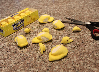 I stumbled downstairs the other morning, groggy and grouchy, and got out a pair of scissors to open a bag of cereal. Then, I saw them on the kitchen counter. Peeps. There were a few new boxes that I'd picked up for 75% off after Easter, as well as a few dry, remaining Peeps from the bird's nest cookies I'd made. I stared at them, half asleep. Scissors in hand, I approached the unsuspecting Peeps.