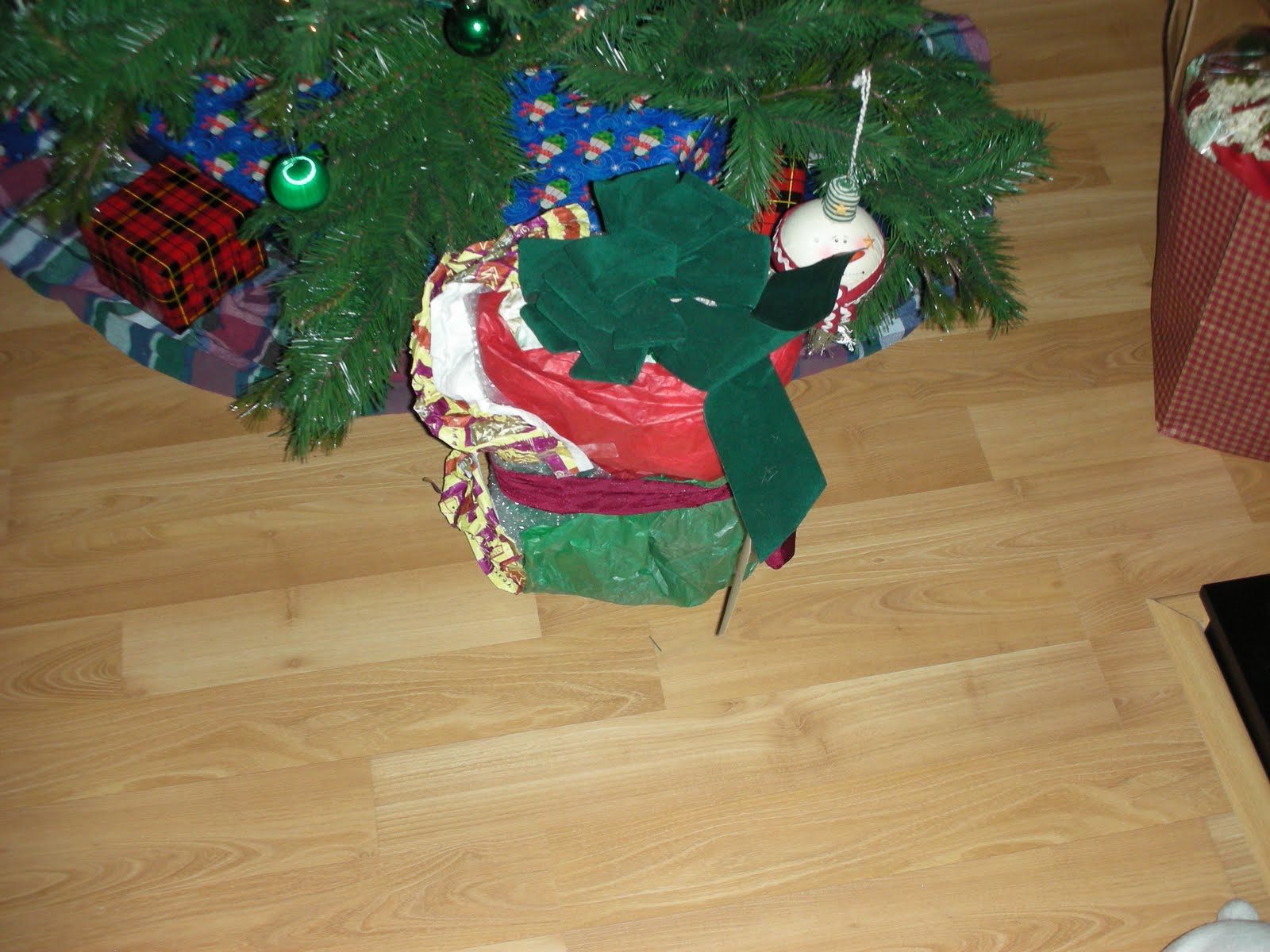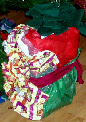 I've made a joke out of my trouble wrapping gifts. In addition to all the scrappy-looking presents I *try* to make look decent, I create 1 ridiculously, intentionally ugly gift, wrapped with just about everything. Tape random bits of scrap papers and tie it with an assortment of leftover, reused bows. If you have some Elmer's Glue, a sticky handprint would be right at home on this. You can even sprinkle glitter on it afterward, though I have to say that wouldn't be quite keeping with the anti-wrapping lifestyle. Too much effort.