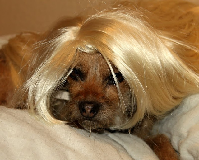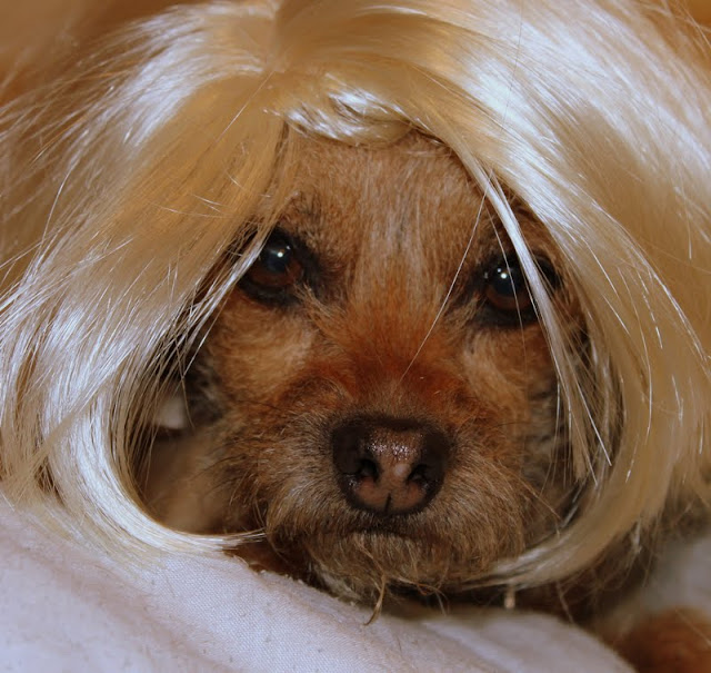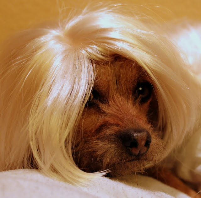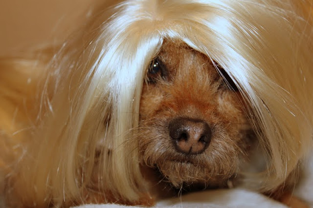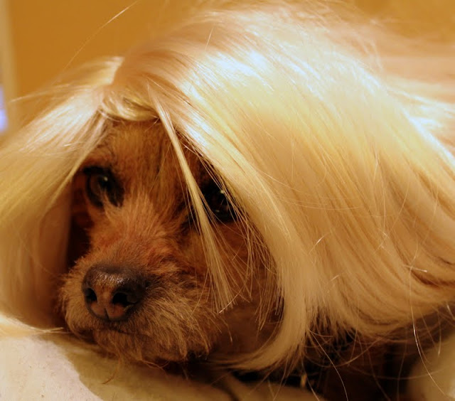 With the wig, Biscuit looks exactly like this little old lady I know.