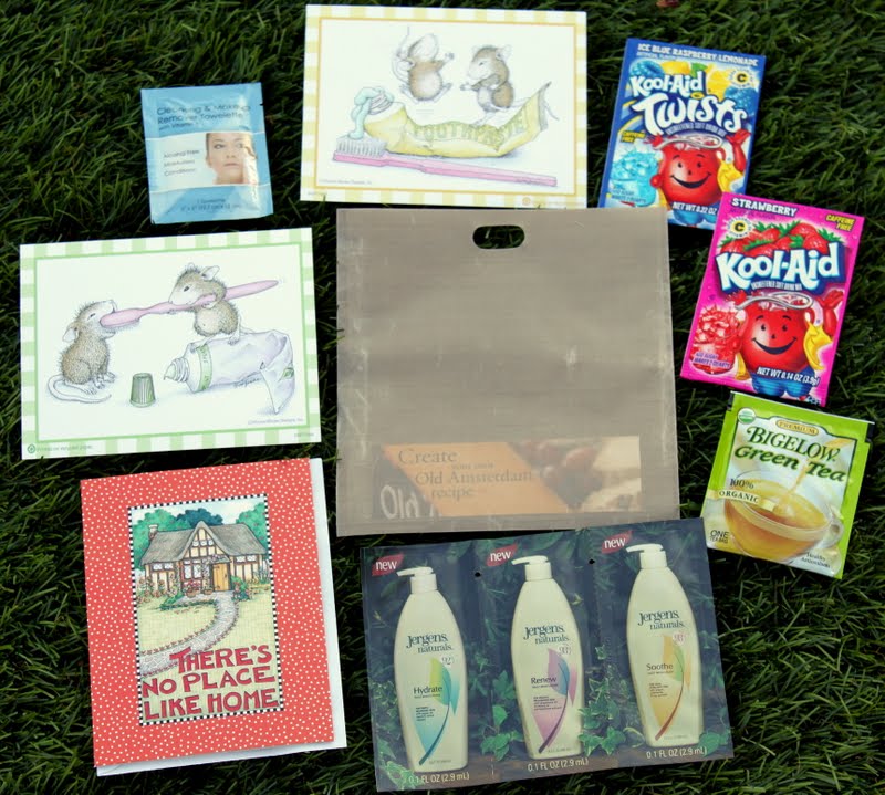 Prize #1: Scentsy Air Freshener, Kool-Aid (Oh Yeah!), a packet of green tea, Bodycology samples in Brown Sugar Vanilla, House Mouse postcards, a small bar of soap (Made in Australia - fancy!) and a blank Mary Engelbreit card