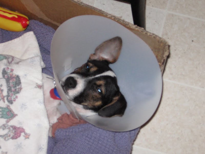 After she was spayed, Sexy Nerd and I requested that Pica be sent home wearing a cone (really, how much can you trust a Jack Russell not to chew her stitches?) The veterinarian thought it was unnecessary, but complied.