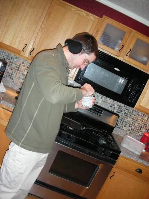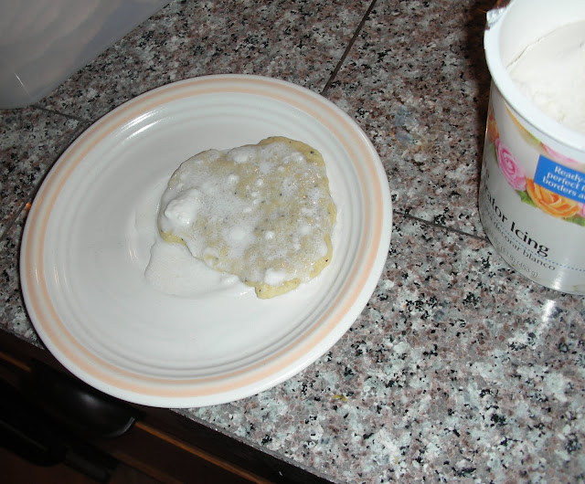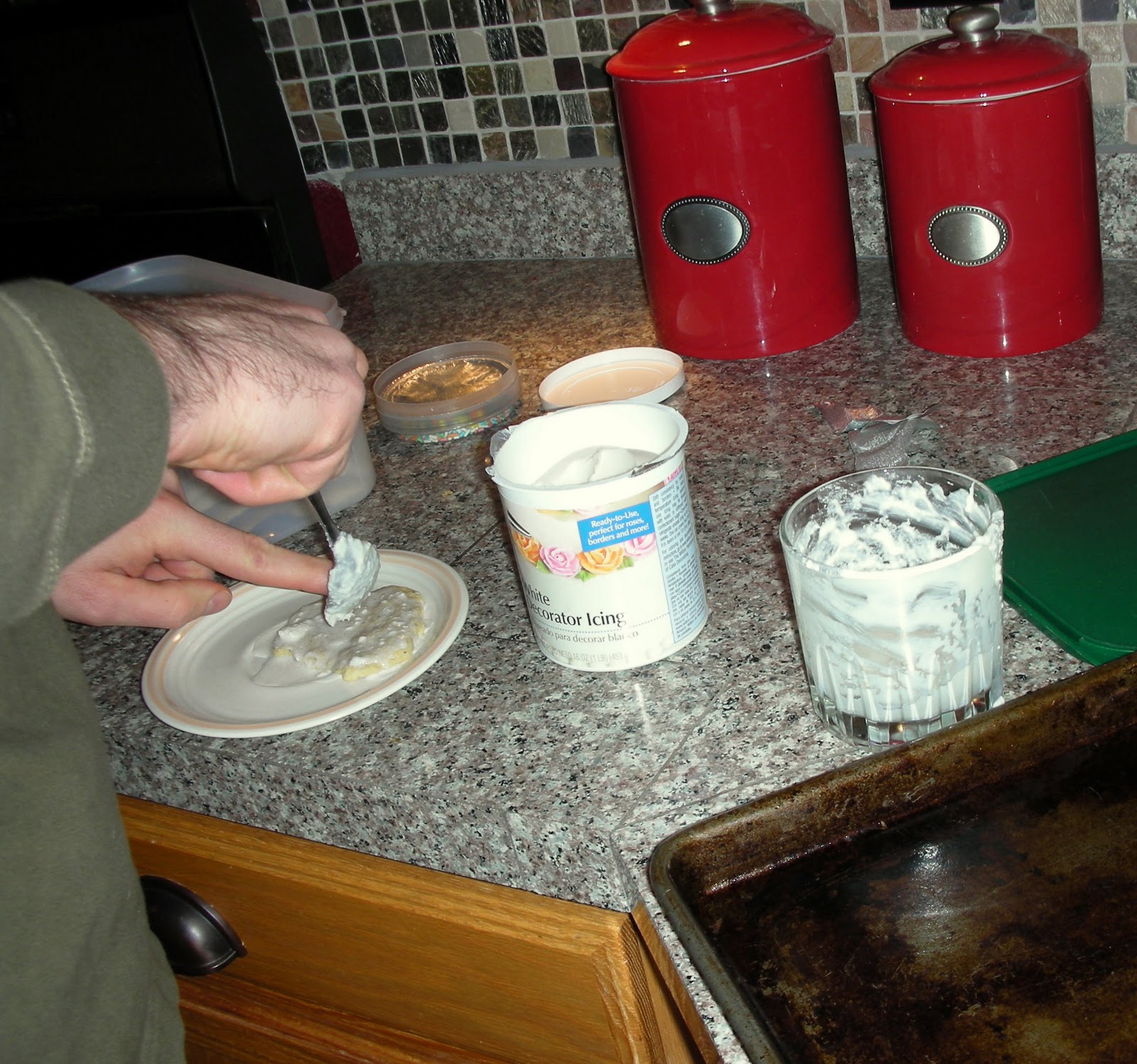 Problem #3? (Nothing is easy, right?) I'd saved a trip to the store by finding an egg-free, powdered sugar-filled recipe. Ready to decorate, I realized I'd used so much powdered sugar in the cookies that I didn't have enough left to make icing. Sexy Nerd found an old tub of frosting, one neither of us remembers buying, in the back of our pantry. It was incredibly thick, but he thought he could make it work.