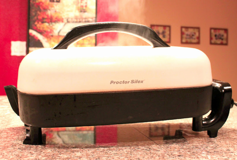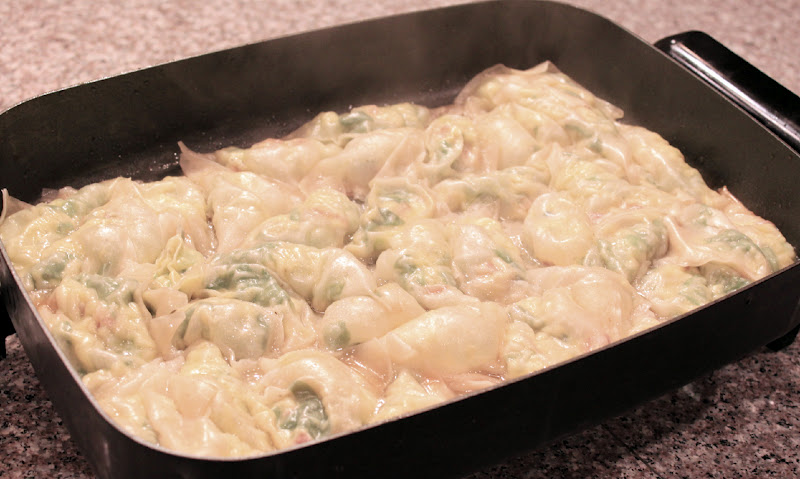 Any pan will do the trick, but my electric skillet from the clearance aisle at Bed Bath & Beyond (it wobbles dangerously because it is missing a leg - I still say it was a deal!) can hold all 48 potstickers at once. Technically, it's a bit of a squeeze and they all stick together this way, but the sooner you're done cooking the potstickers, the sooner you can eat them.