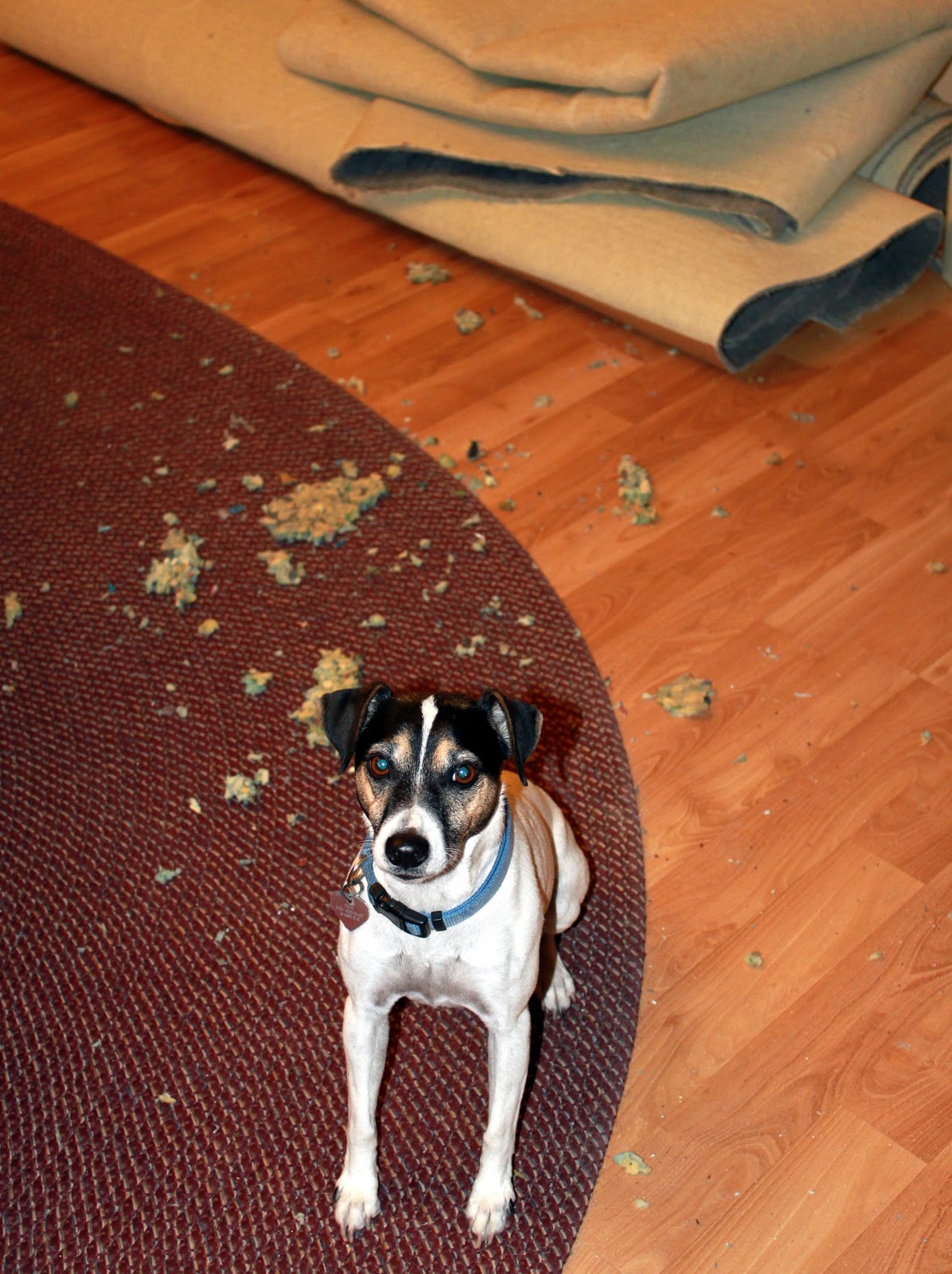 She's trying to look all cute and sorry for what she did, but all the while she's plotting a way to get herself more of the apparently delicious carpet padding.