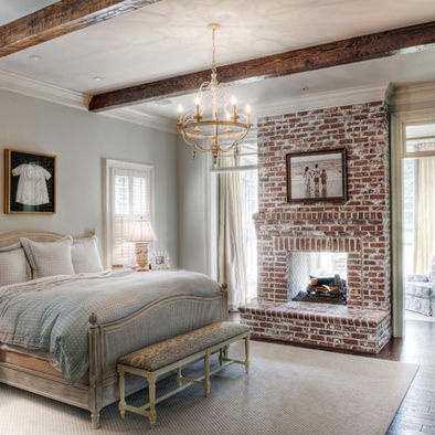 6/25/17 Update: The fireplace is stone, but it's very charming. We do have a brick wall in the guest bathroom, all the way to the 16' ceiling.