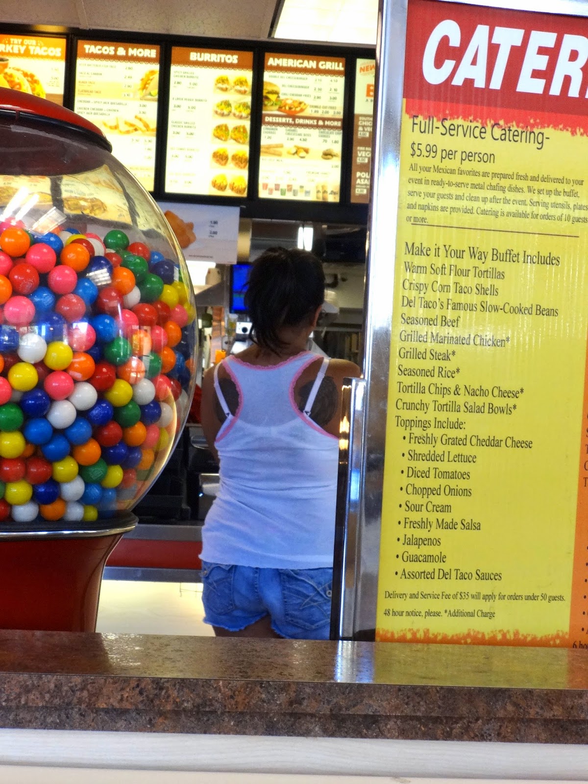At my most recent Del Taco visit, it was about 1pm on a weekday and I was on my lunch break from work. The perfect time to be out in public IN YOUR PAJAMA TOP WITH YOUR BRA SHOWING! There were also huge fuzzy slippers, which are not visible in the above photo, unfortunately. Normally I wouldn't have paid this gal much attention, but she was being such a jerk to the cashier. Apparently, she'd ordered some food from Del Taco a week ago (!) and hadn't liked it, so now she felt justified in demanding that everything be remade. The poor manager, who seemed like a sweet little old lady, had to actually say "I'm trying to help you. Please stop screaming at me." After glaring at the employees as they made her free food, she ripped her to-go bag out of the manager's hand, stomped outside, and sat on the ground of the parking lot with a homeless man.