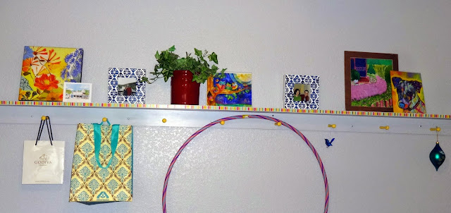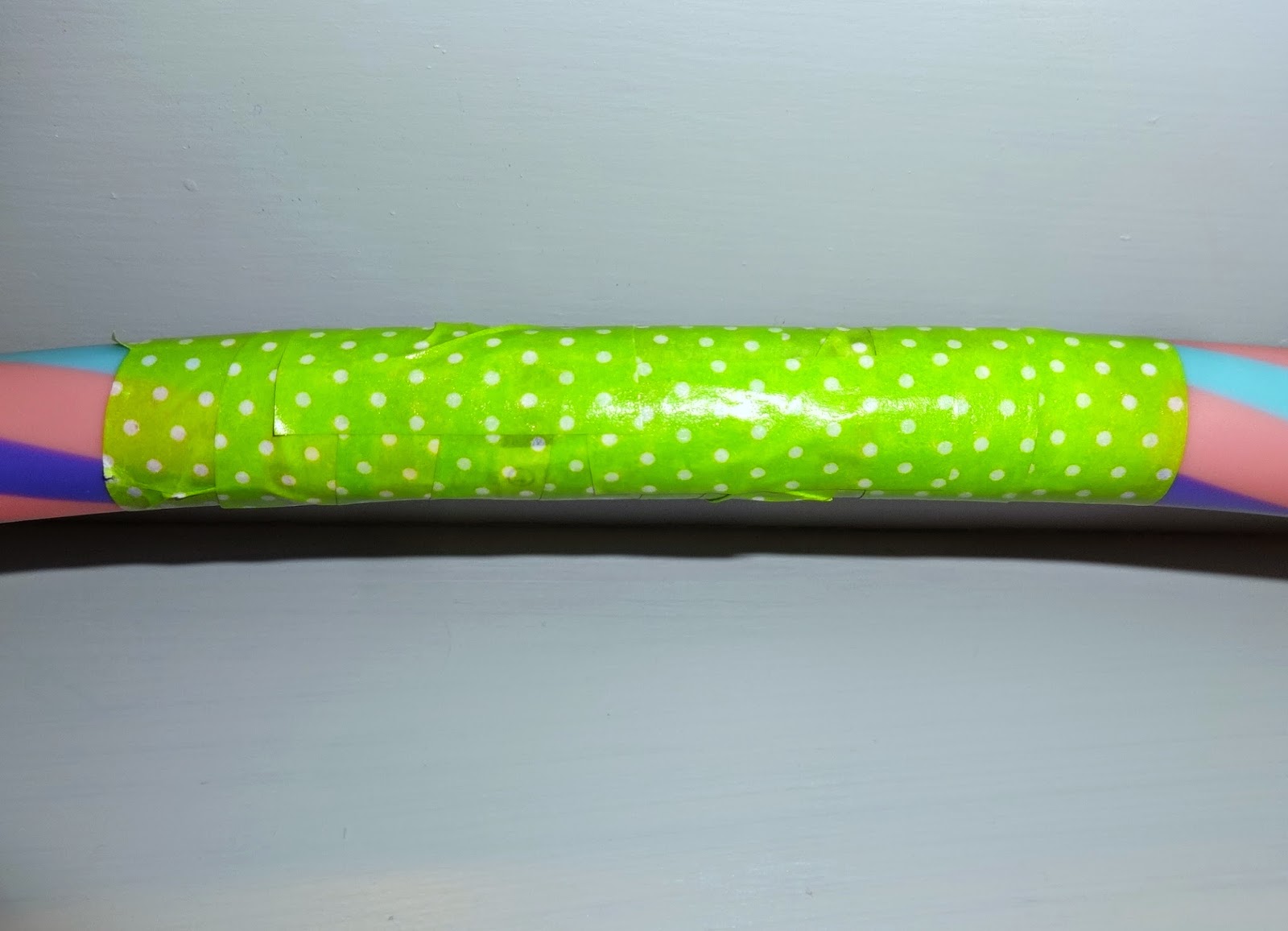 In fact, the Washi Tape is so easy to use that I took a page our of Heather Spohr's handbook and abandoned my lazy ways, painstakingly covering the entire hula hoop in Washi Tape. I alternated between green and blue tapes in 3" sections, which I carefully premeasured to ensure equal amounts of each color consistently throughout the hoop.