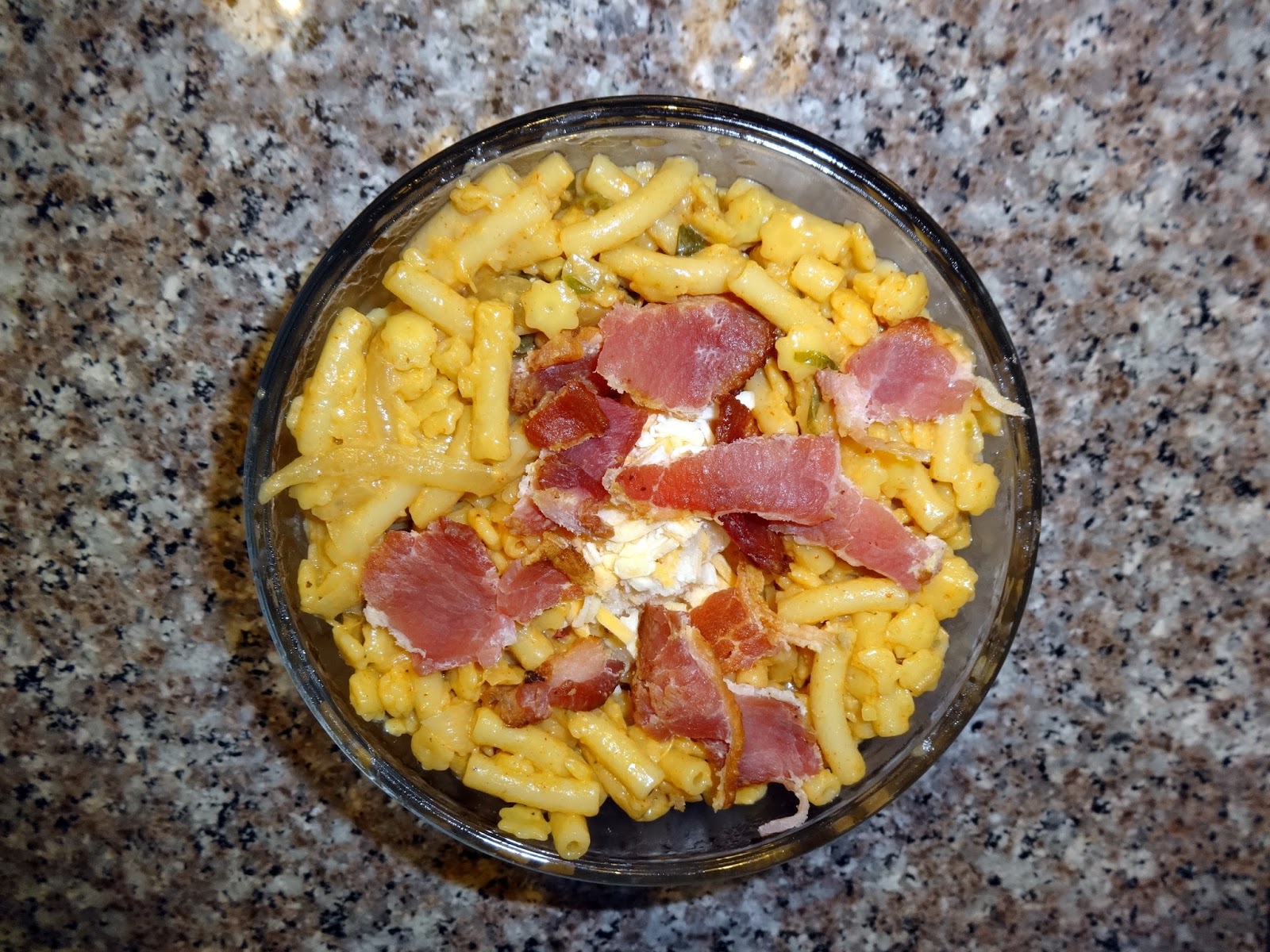 With the addition of bacon, green chile, and a handful of cheddar, the macaroni and cheese was especially delicious.