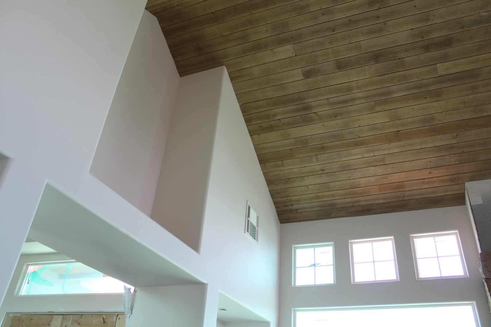 We're in love with our tongue and groove ceiling. It was installed rough-side down and stained Sherwin Williams Hawthorne. Sexy Nerd and I actually left the house with sore necks after seeing it the first time, as we spent a good hour or so gazing up at it.