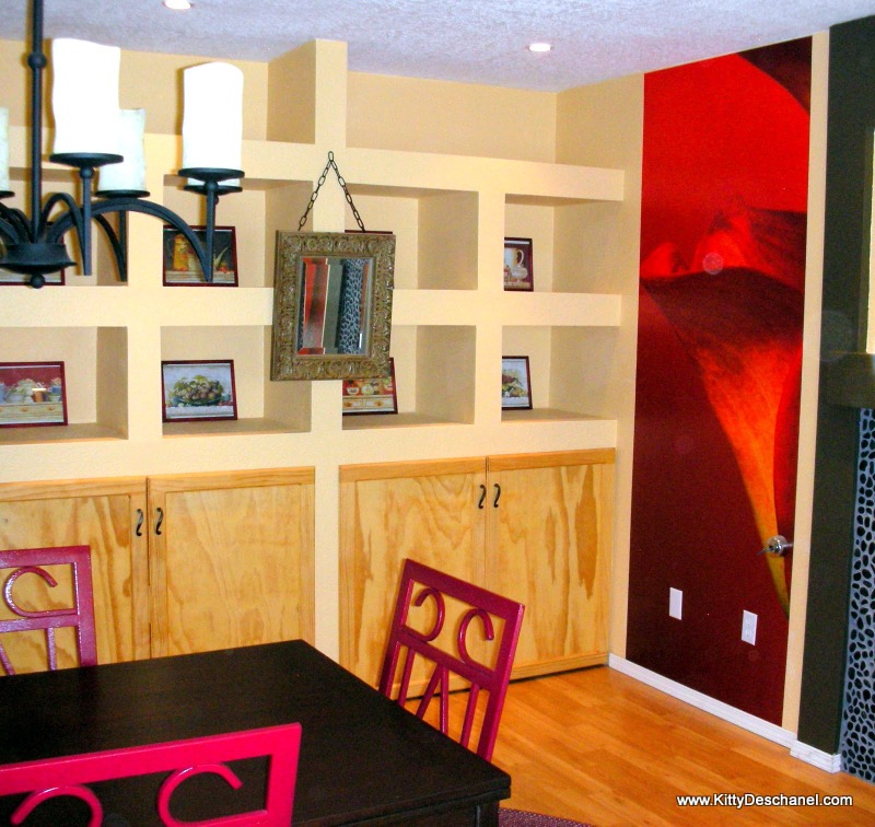 Sexy Nerd built the bookcase, hung the chandelier, installed the can lights, refinished my childhood dining table, installed the tulip wallpaper mural (it's a single mural, split in half), replaced the musty carpet, and painted every surface, including our burgundy dining chairs.