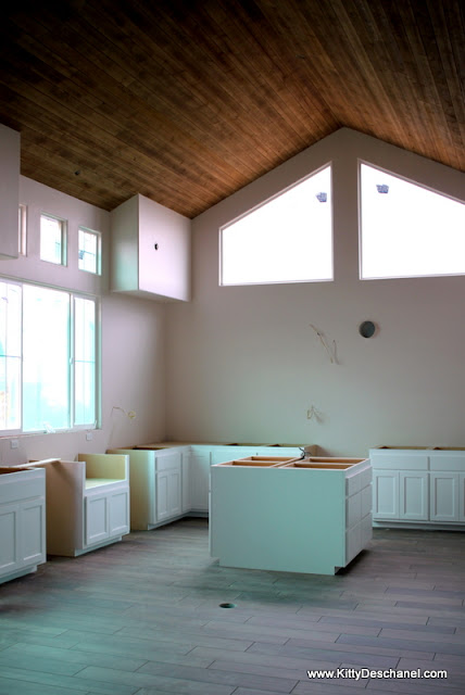 Our kitchen cabinets? Yes...I think. There are upper cabinets coming and I'm still on the fence about how this is going to look. The drawer fronts you see here are all being redone and the island is not installed straight. It's turned the wrong direction too, but I can't decide if I prefer the mistake to what we'd planned. I'm thinking that we can create something decorative for that plain side after we've moved in. I wonder how Sexy Nerd would feel about wallpapering it with a flower mural, like a small scale version of what's in our current dining room.