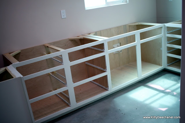 With dents in the brand-new doors, noticeable seams, and drawers that stick out instead of closing evenly, the quality doesn't seem to be there. These were too expensive to be so crappy! Sexy Nerd insists I just need to be patient though and not judge the kitchen while it's in progress.
