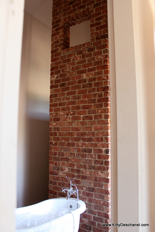 This wall is in the center of the bathroom. It's 16 feet tall and has brick on all 4 sides. How cool is that?
