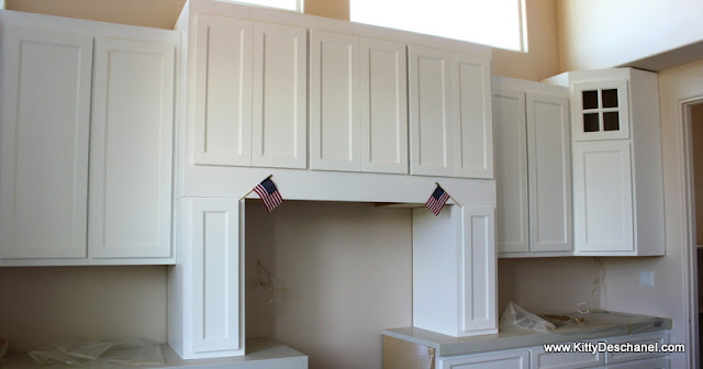 This is all still a work in progress. Crown molding will be installed on top of each cabinet soon and Sexy Nerd is going to add a red brick backsplash from countertop to ceiling after we move in. I have no idea what color hardware to choose.