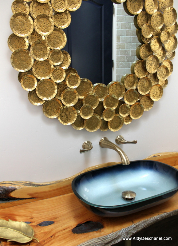 One of my favorite rooms in our new house so far is the small bathroom off our hallway. With a curved floor, it's a bit unusual. SN created the countertop himself out of a single piece of alligator juniper. The oversized mirror I ordered from Wayfair, called a Honey Mushroom mirror, really pulled everything together. The blue vessel sink was a $25 clearance find and the Emtek lead crystal doorknobs were marked down to even less. Plus, it happens to have the most beautiful shower in the history of showers. (What a shame it's the least used shower in the house! I suppose that will help keep it beautiful.)