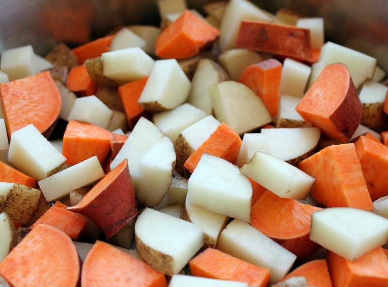 - 2 potatoes + 2 sweet potatoes, diced, boiled 20 minutes, and cooled in ice water